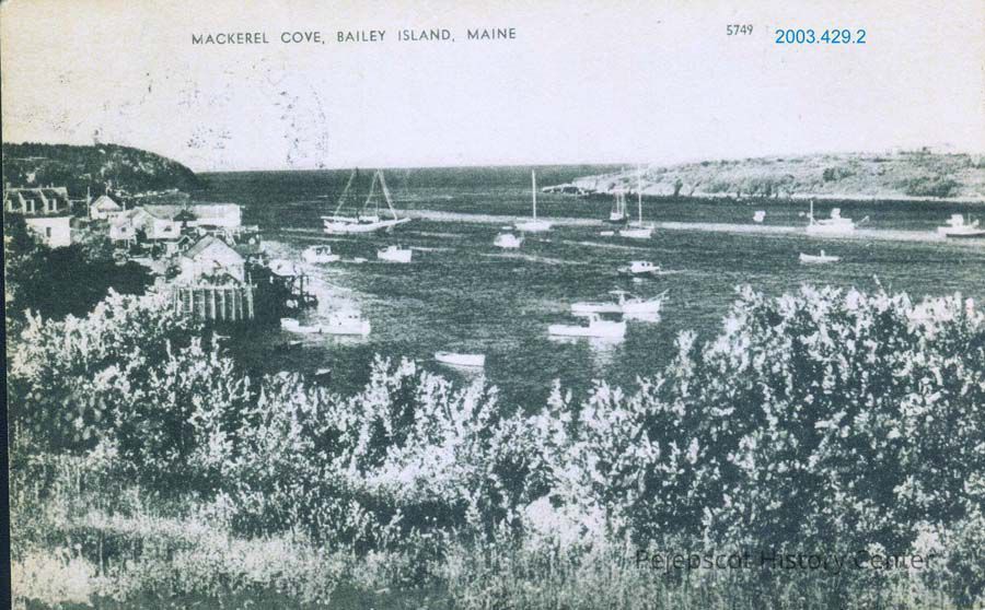 A black and white postcard of Mackerel Cove, Bailey Island, Maine, is postmarked 8/12/1954. It has a divided back and no stamp.