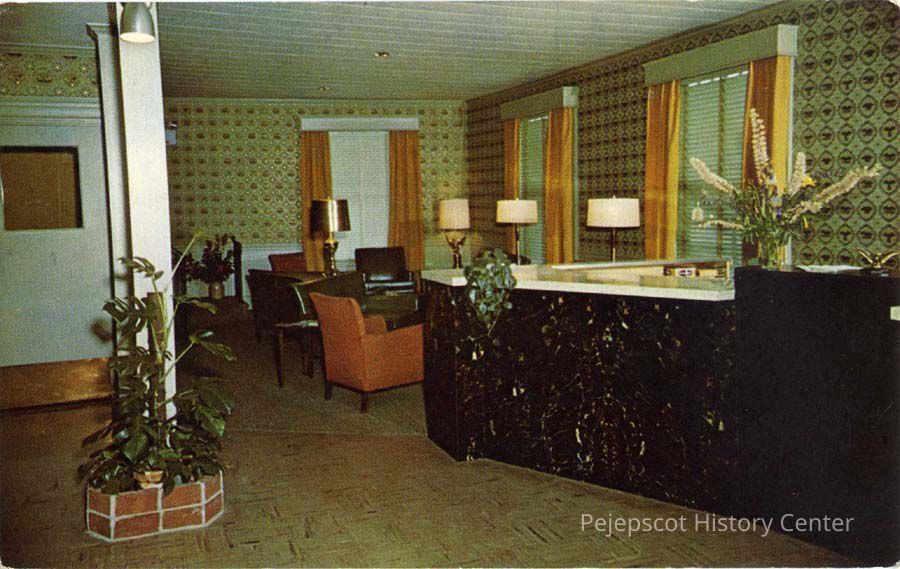 An undated color postcard shows the main desk at the Hotel Eagle, 28 Middle St., Brunswick, Maine.Collection