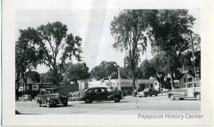 Corner of Maine and Pleasant Streets, 1950s, from east. Mobilgas Station at SW corner. In 2010, this was a 7-11 store.