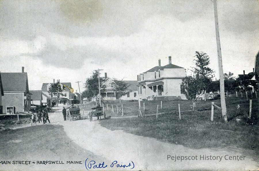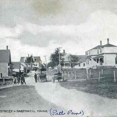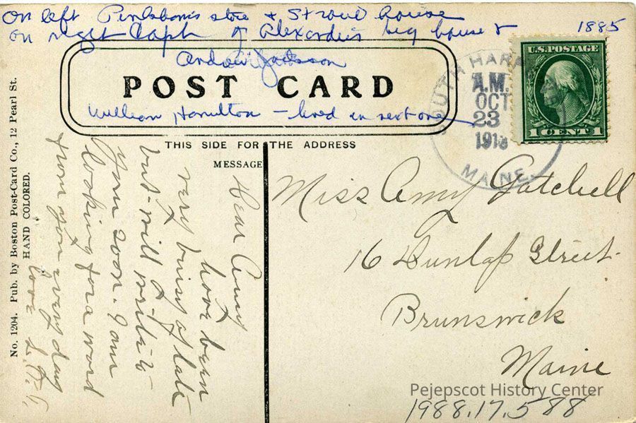 An undated hand colored postcard of Maine Street, Harpswell published by Boston Post-Card Co., 12 Pearl Street. The postcard is addressed to Miss Amy Gatchell, 16 Dunlap Street, Brunswick, Maine. It is postmarked October 23, 1913 (or 1918). There is a personal message to Amy Gatchell on the back of the postcard. The notation on the postcard indicates that the depiction is of Potts Point; on the left are Pinkham's store and the Strout house, and on the right are Capt. Andrew Jackson Alexander's big house and William Hamilton's house. The year 1885 is also noted.Collection