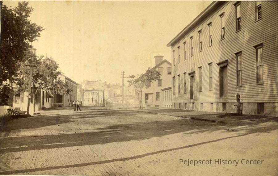 B/W photo of Main Street, Topsham, ME. The bridge and Brunswick can be seen in the background. The Bowdoin Mill is on the left. No date.
