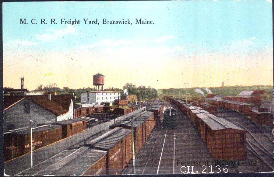 A color picture postcard of the Maine Central Rail Road Freight Yard. Brunswick, ME. Dated 1925.