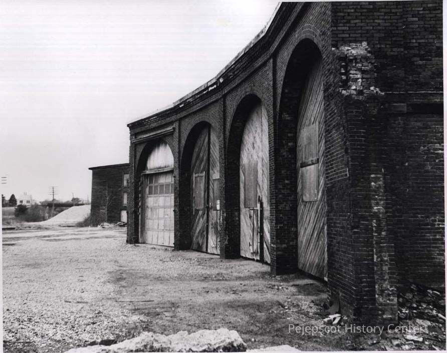 A B/W photograph of the Maine Central Railroad Roundhouse off Cedar Street. The Spring Street overpass can be seen in the background. 4/1980