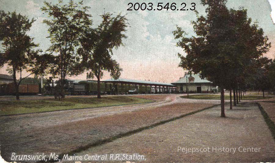 A color picture postcard of the Maine Central Railroad Station in Brunswick has a one-cent stamp attached. It is addressed to Mrs. J. P. Johnson of Bibbers Island, Maine, and is postmarked 6/23/1908.Collection