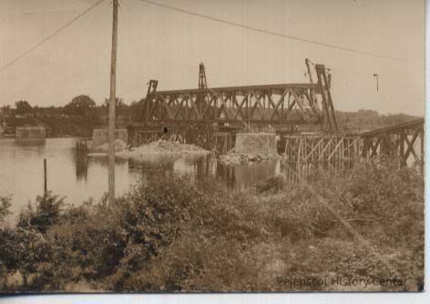 Photo of the Maine Central Railroad Bridge being reconstructed after the 1936 flood of the Androscoggin River. Brunswick and Topsham, Maine.