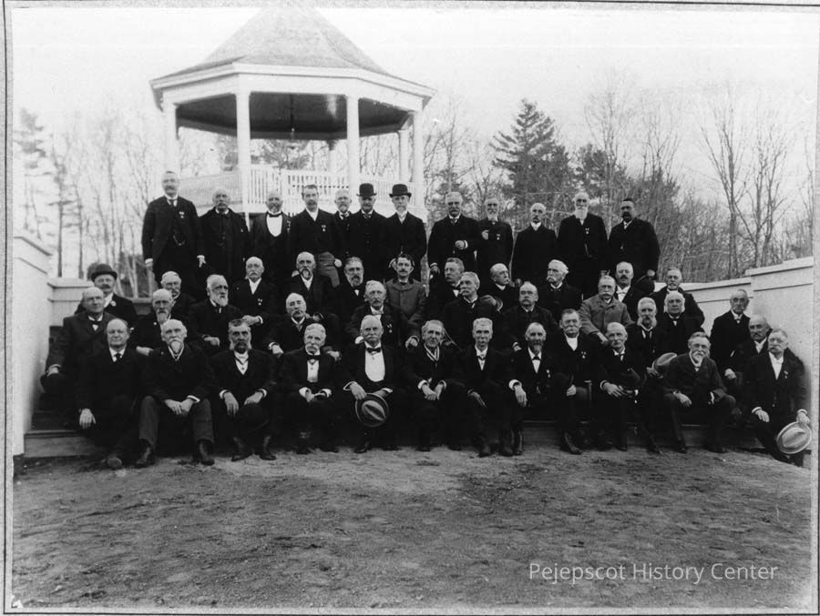 A black and white copy print of a group seated before a bandstand. Joshua L. Chamberlain is in the third row, 3rd from the right. On the back in pencil, the photograph is identified as "Maine Commandery, MOLLUS, 1899".