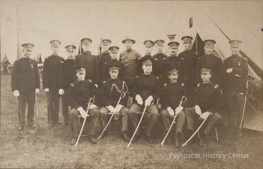 A B/W photograph of a group of soldiers. Penciled writing on the back of the photograph says, "Nat'l Guard? Wm Peterson sitting center? G. M. Elliot in uniform center?" No Date.