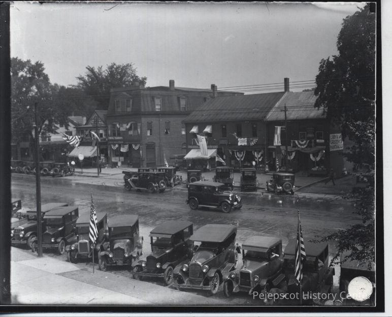 Photo of a parade, showing Maine Street at Center Street from Town Hall. 113-115 Maine Street and 117-121 Maine Street visible.