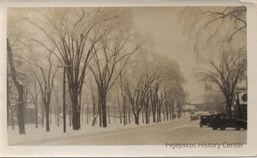Photo of Maine Street looking south from near Pleasant St on a snowy day, Brunswick, Maine.