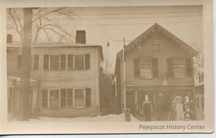 Photo of the west side of Maine Street South of Pleasant Street, Brunswick, Maine. Some details given on the back of the photo.