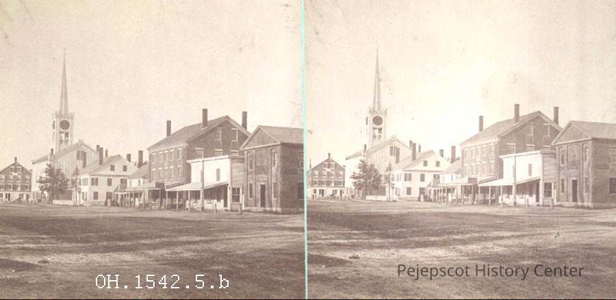 A B/W stereo view of Maine Street Brunswick, ME looking south. The Universalist Church with it's clock tower can be seen in the distance. Undated