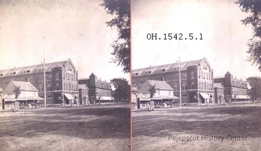 A B/W stereo view of Maine Street, Brunswick, ME showing the Dennison Manufacturing Co. in the Dunlap Block, First National Bank Building and the Odd Fellows block. c:1884