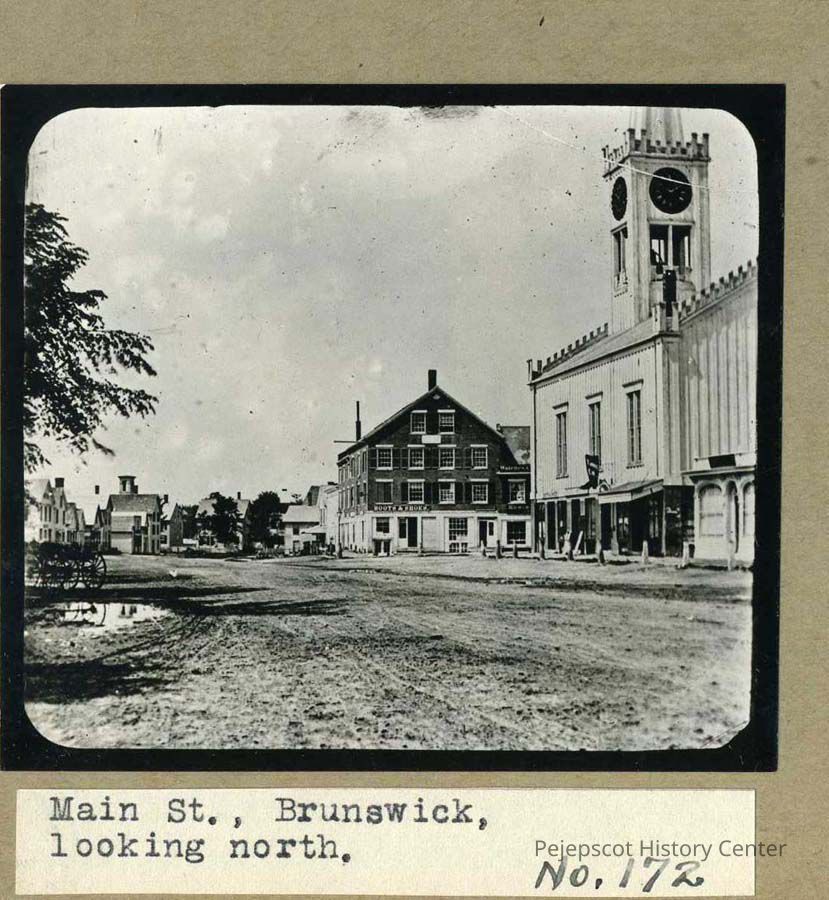 A black and white photo of Maine Street in Brunswick, looking north. Though spelt "Maine Street" now, the caption refers to it as "Main Street." On the right is a clock tower and steeple as well as other buildings. On the left is a wagon. Undated