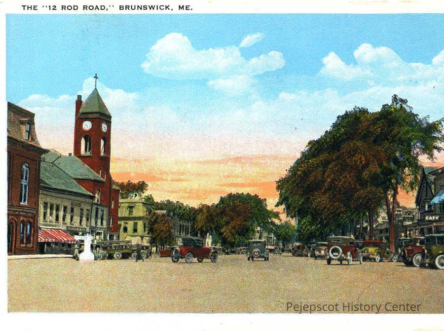 A color postcard of Maine Street, Brunswick, entitled "12 Rod Road". Taken around 1930 showing Town Hall and "silent policeman" at Pleasant St. intersection. Made by Tichnor, Cambridge, Mass.