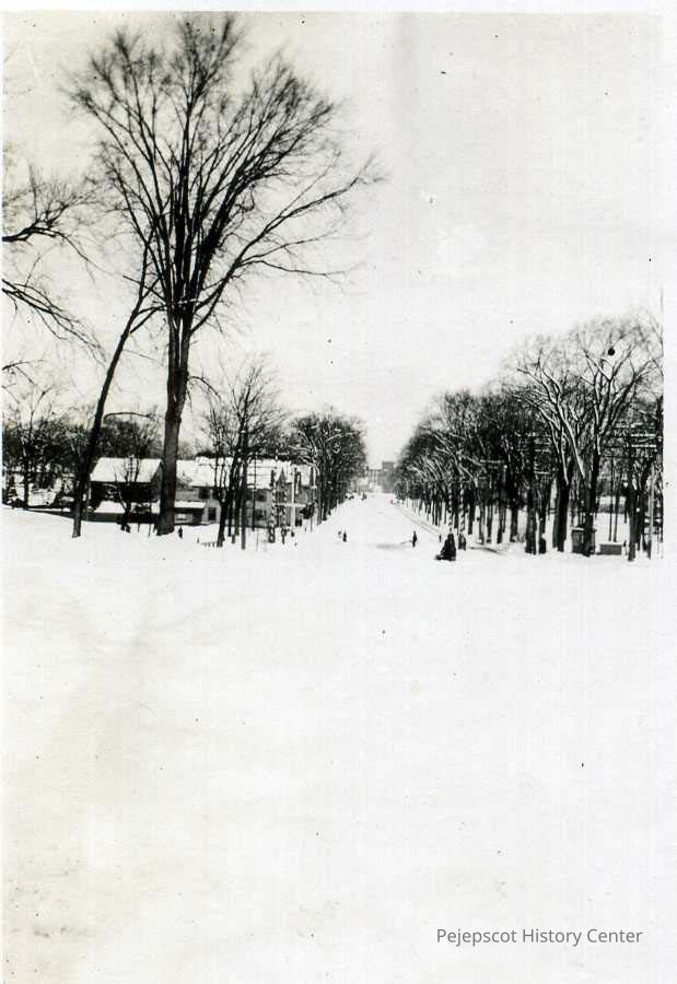 B/W photo looking north on Maine Street toward town - mill in the distance.