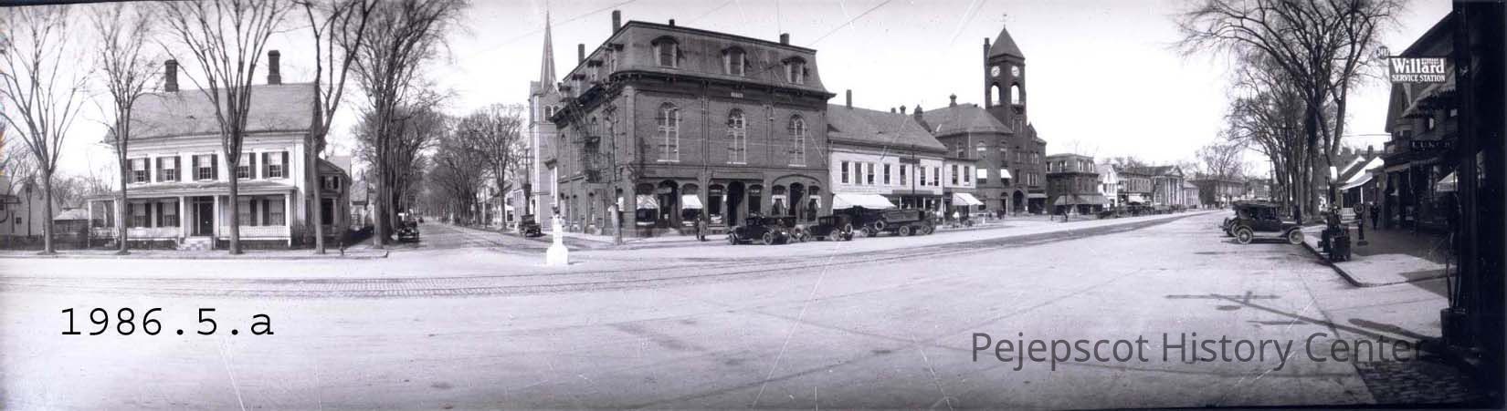 The trolley tracks can be seen as well as the silent policeman at the intersection of Maine and Pleasant Streets. Automobiles are parked at the curb.