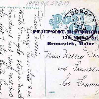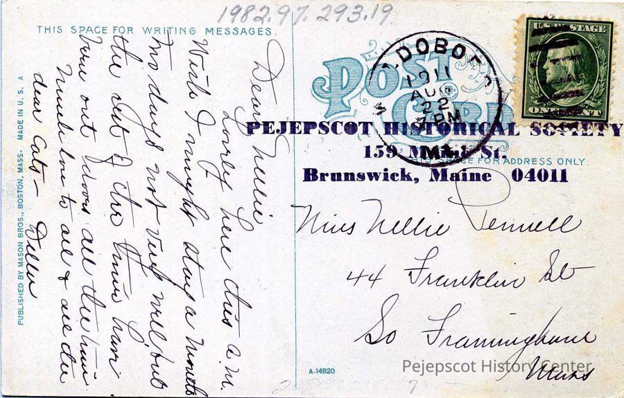 Postcard to Miss Nellie Pennell, 44 Franklin St., So. Framingham, Mass. Postmarked Waldoboro, Maine on Aug. 22, 1911. "Dear Nellie, Lovely here this A.M. Wish I might stay a month. Two days not very well but the rest of the time have been out doors all the time. Much love to all & all the dear cats. Della (?)"Lexicon