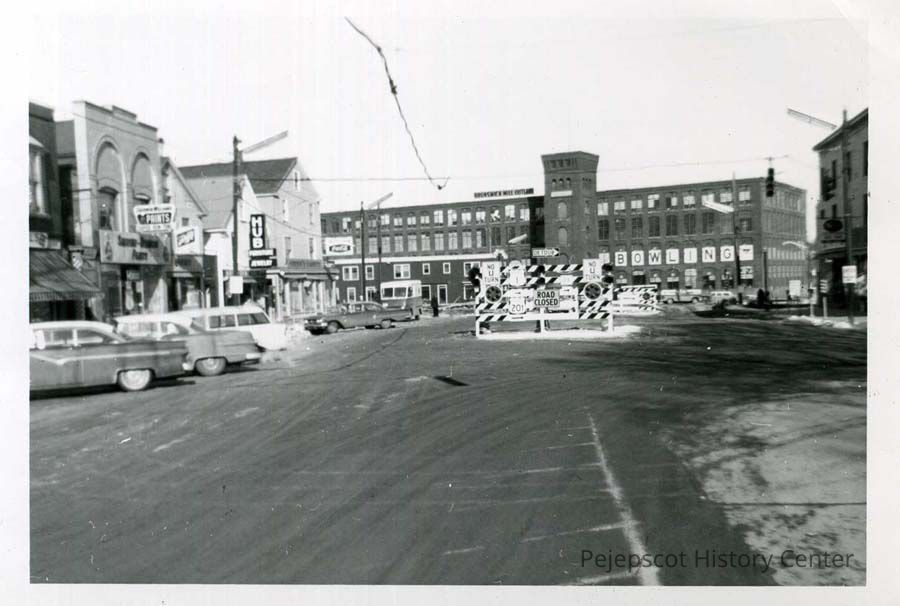 B/W photo of blockaded Maine Street and the closed signs during the construction of the Route 1 bypass.