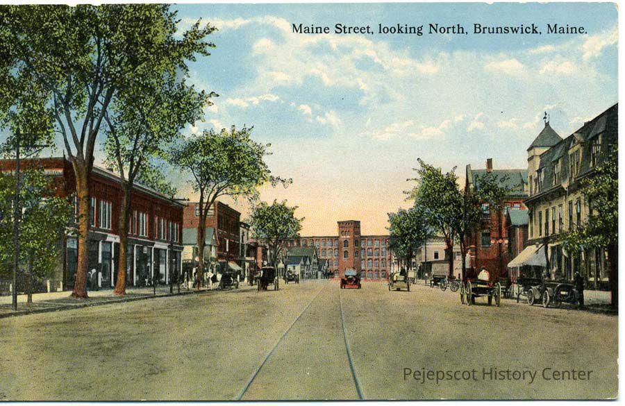 A color postcard of Maine Street, Brunswick. Writing on postcard says "Maine Street, looking North, Brunswick, Maine." Dated between 1925 and 1935.