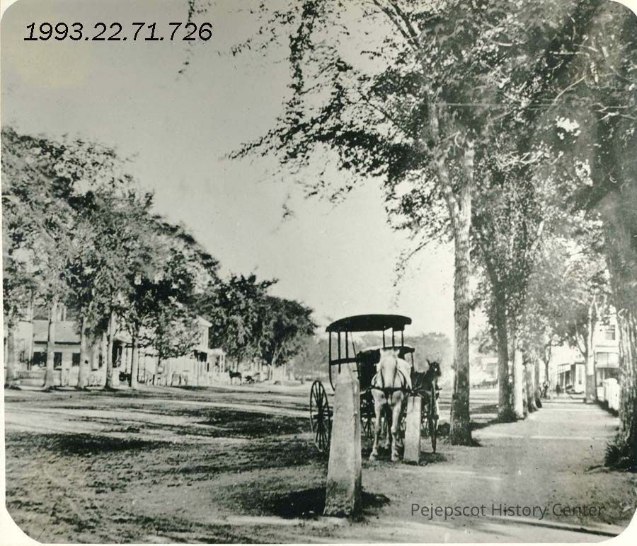 A B/W photograph of Maine Street looking south. The Mall can be seen in the distant background. Pictures are in an album, titled, "Brunswick Maine Pictures Book No. 2, Groups, Streets and Buildings." The photos were produced from a lantern slide in the possession of PHS on 11/04//1921. UndatedCollection