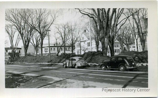 Maine Street and northern end of Park Row and Mall, 1940s (based on cars in photo) looking east with School Street at center.