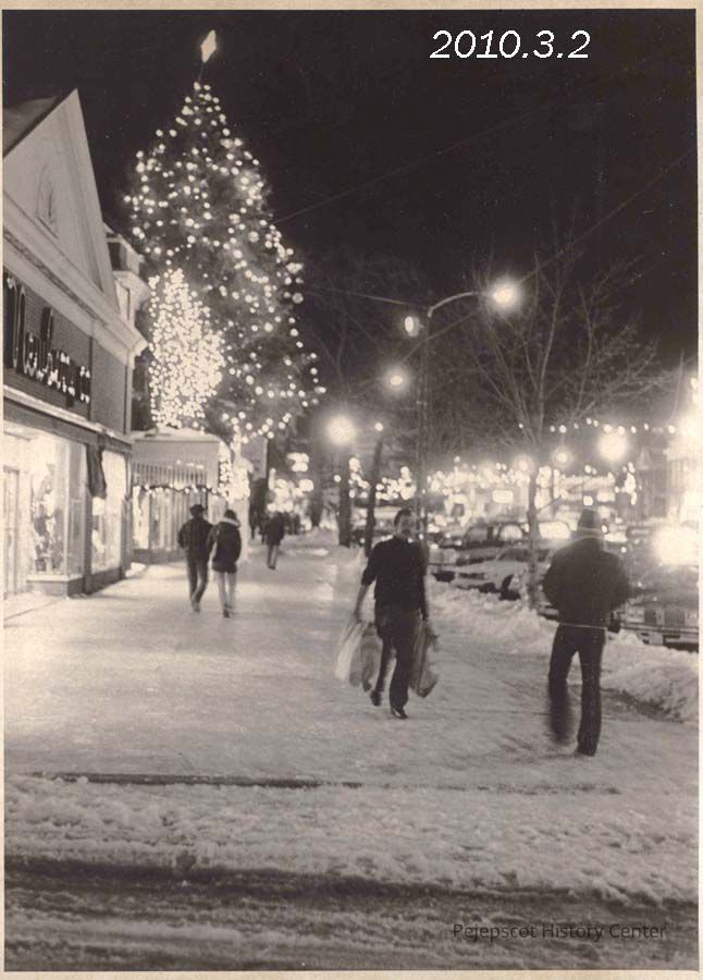 A B/W photograph of a snowy Maine Street at Christmas time. It was taken in front of Newberry's Department Store. 12/21/1977