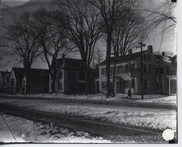 Photo of Maine Street at Everett Street in winter, Brunswick, Maine.