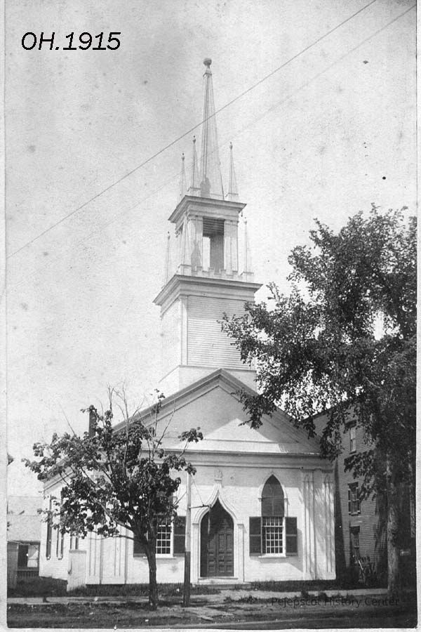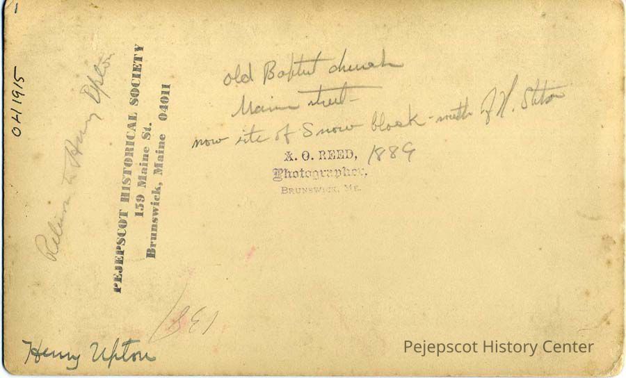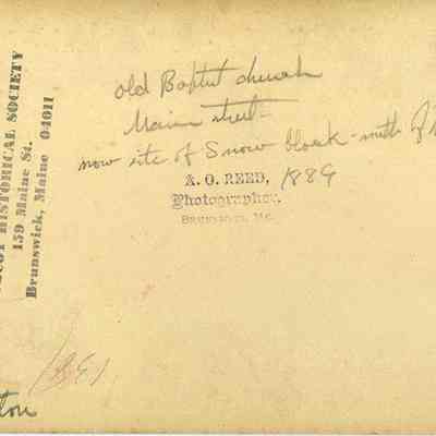 A B/W photograph of the old Baptist Church on Maine Street, Brunswick, ME. 1889