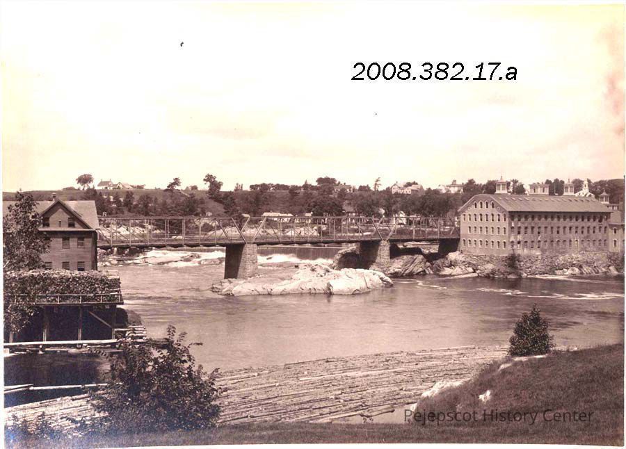 A B/W photograph of the Main(e) Street bridge. The photo was taken from the Brunswick side. The Bowdoin Mill can be seen. Undated