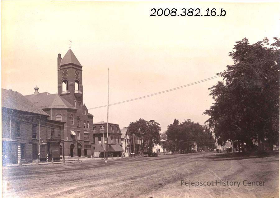 A B/W photograph of Main(e) Street, Brunswick looking north. The Old Town Hall can be seen. Undated