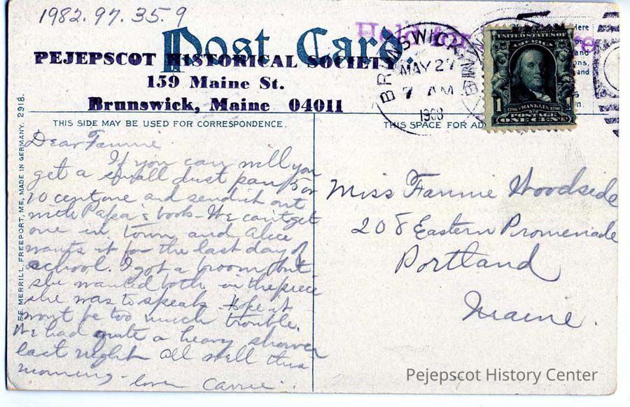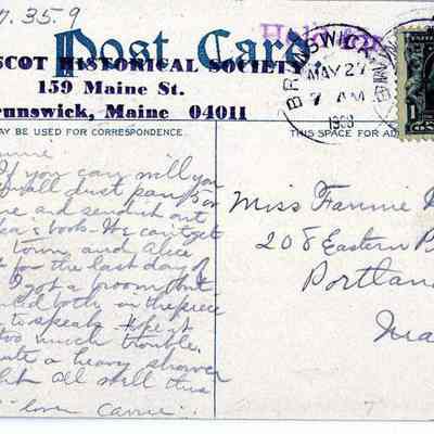 To Miss Fannie Woodside, 208 Eastern Promenade, Portland, Maine. Postmarked on back: May 27, 1908 7 A.M, Brunswick, Maine. Postmarked on front: May 27, 1908, 9 A.M, Portland, Maine.
