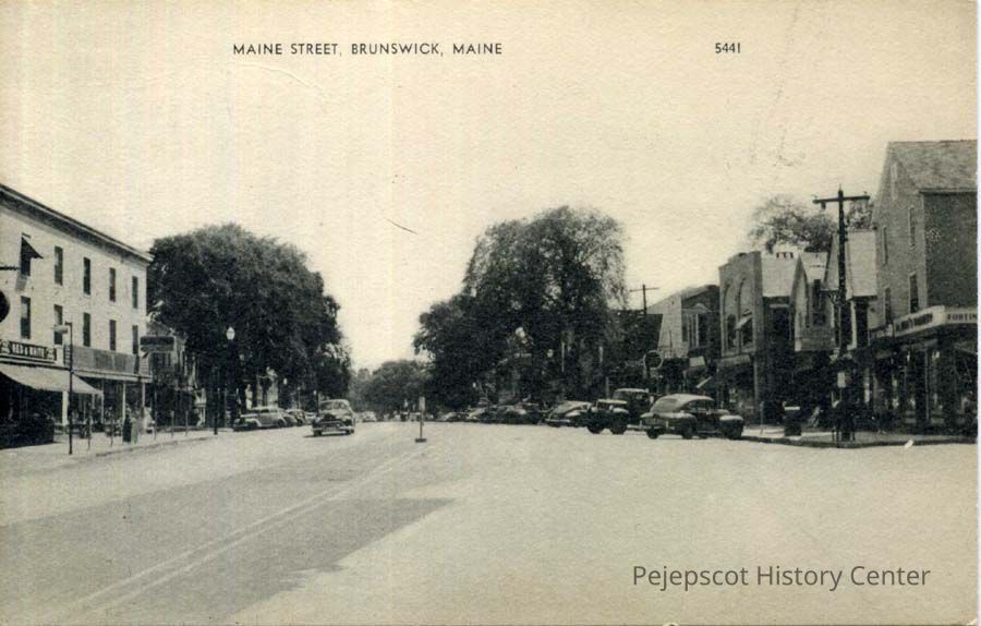 An undated black and white postcard shows Maine Street in Brunswick, Maine, looking south.Collection