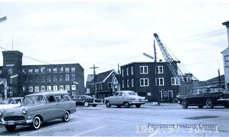 A B/W photograph of Maine Street, Brunswick looking north near the intersection with Mason Street, 1961. Fort Andross in the background. Buildings on the right were torn down for the Route 1 bypass.