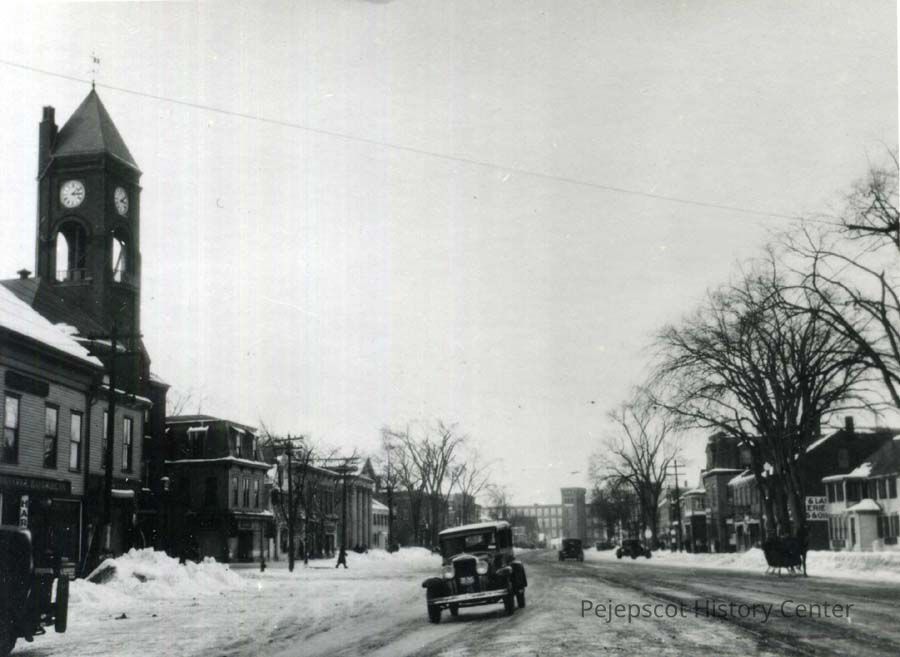 An undated black and white photograph of Maine Street, Brunswick in the winter time. The Old Town Hall can be seen. Fort Andross is in the background.