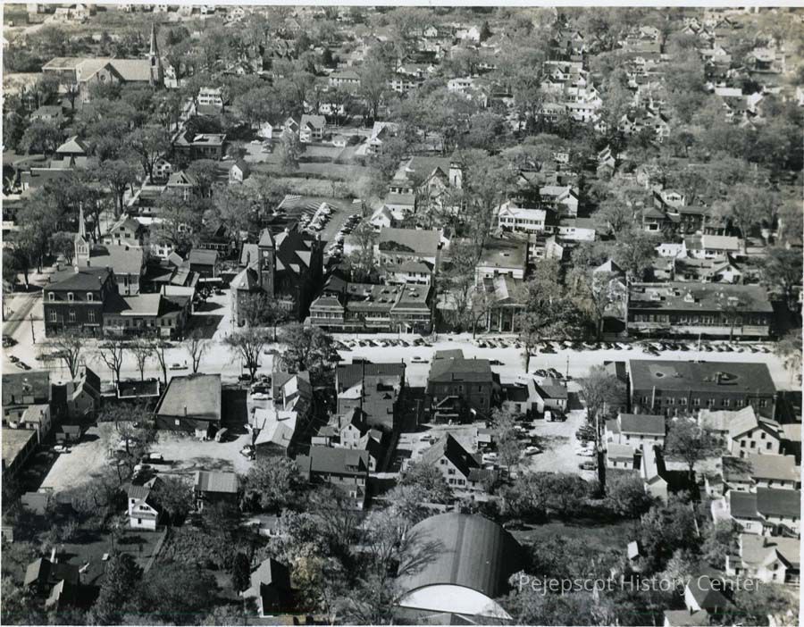 A B/W aerial photograph of the center of town and the western side of Maine Street, Brunswick. Undated