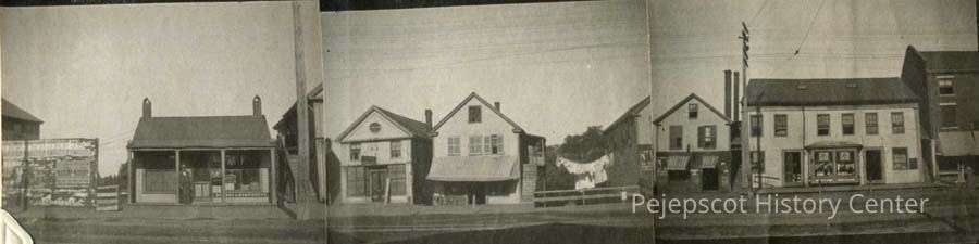 Three B/W photos put together to form a panoramic view of east Maine Street, Brunswick, Maine. These buildings were on the north side of Mason Street and are no longer extant. The Day Block (formerly at the corner of Mason and Maine Streets) is just visible at the far right. The back is inscribed, "East side of Maine Street. Day block towards the bridge". Undated.Lexicon