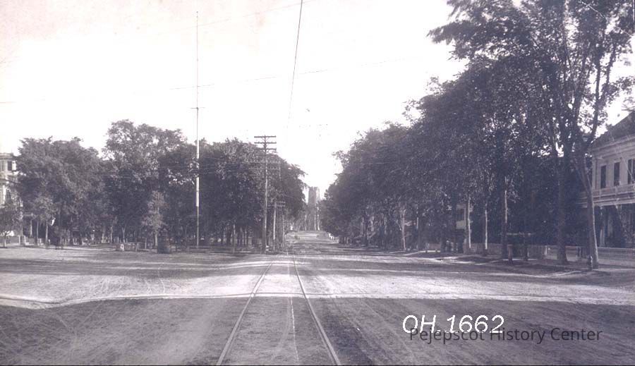 A B/W photographic view of Maine Street, Brunswick, ME looking south. Park Row on left, Brunswick Mall surrounded by trees and the War Veterans Memorial, First Parish Church in far background, and homes on right. Photo not dated.