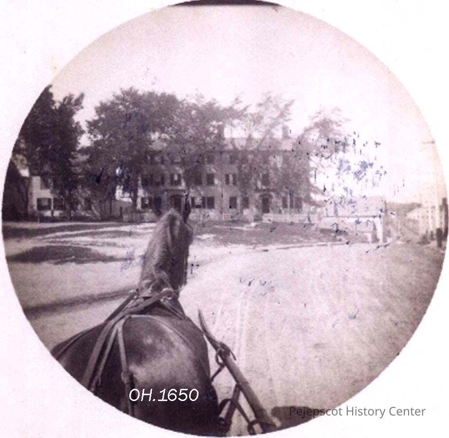 A circular view of two houses on Maine Street, Brunswick, ME near the bridge to Topsham, August 1889. The houses were later torn down. In 1890 the Cabot Company wanted to expand the Mill and received permission from the Town of Brunswick to move Maine Street. The mill expansion was completed in 1892.