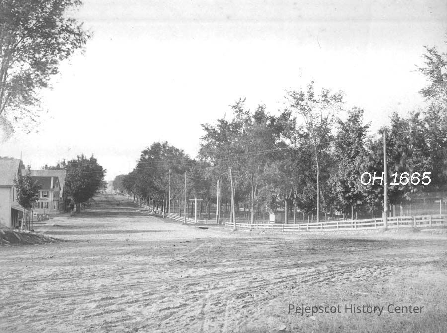 A B/W photographic view of Maine Street looking North towards Topsham. Undated