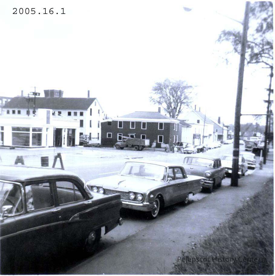 A B/W photograph of the intersection of Mill and Maine Street, Brunswick. Maine