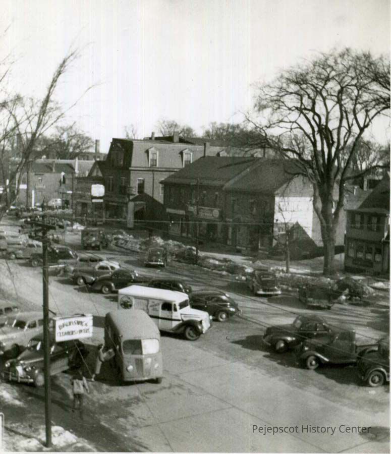 B/W photo of Maine Street, Brunswick, ME, looking north from the Town Hall. No date.