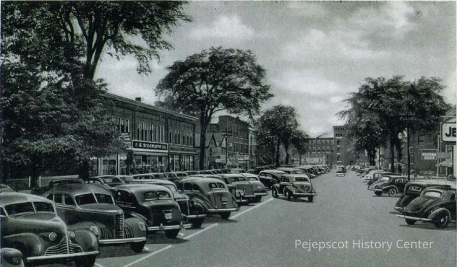 B/W postcard of Maine Street, Brunswick ME. Ca 1930's