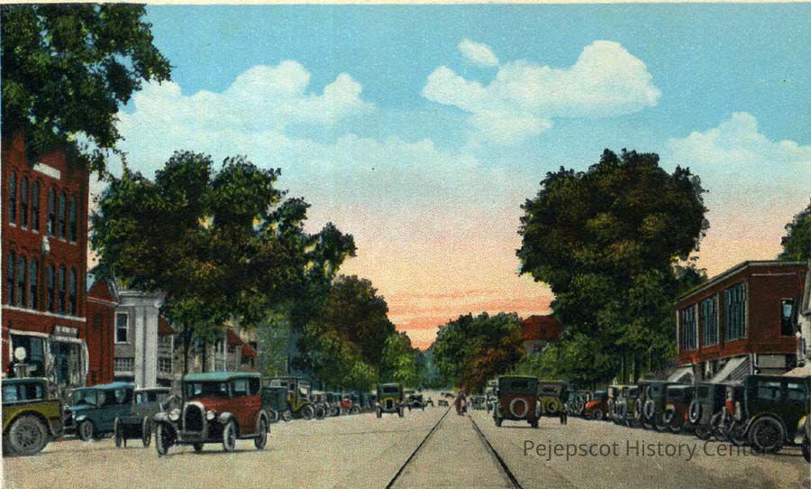 Color postcard of Maine Street looking south, Brunswick ME. No date.