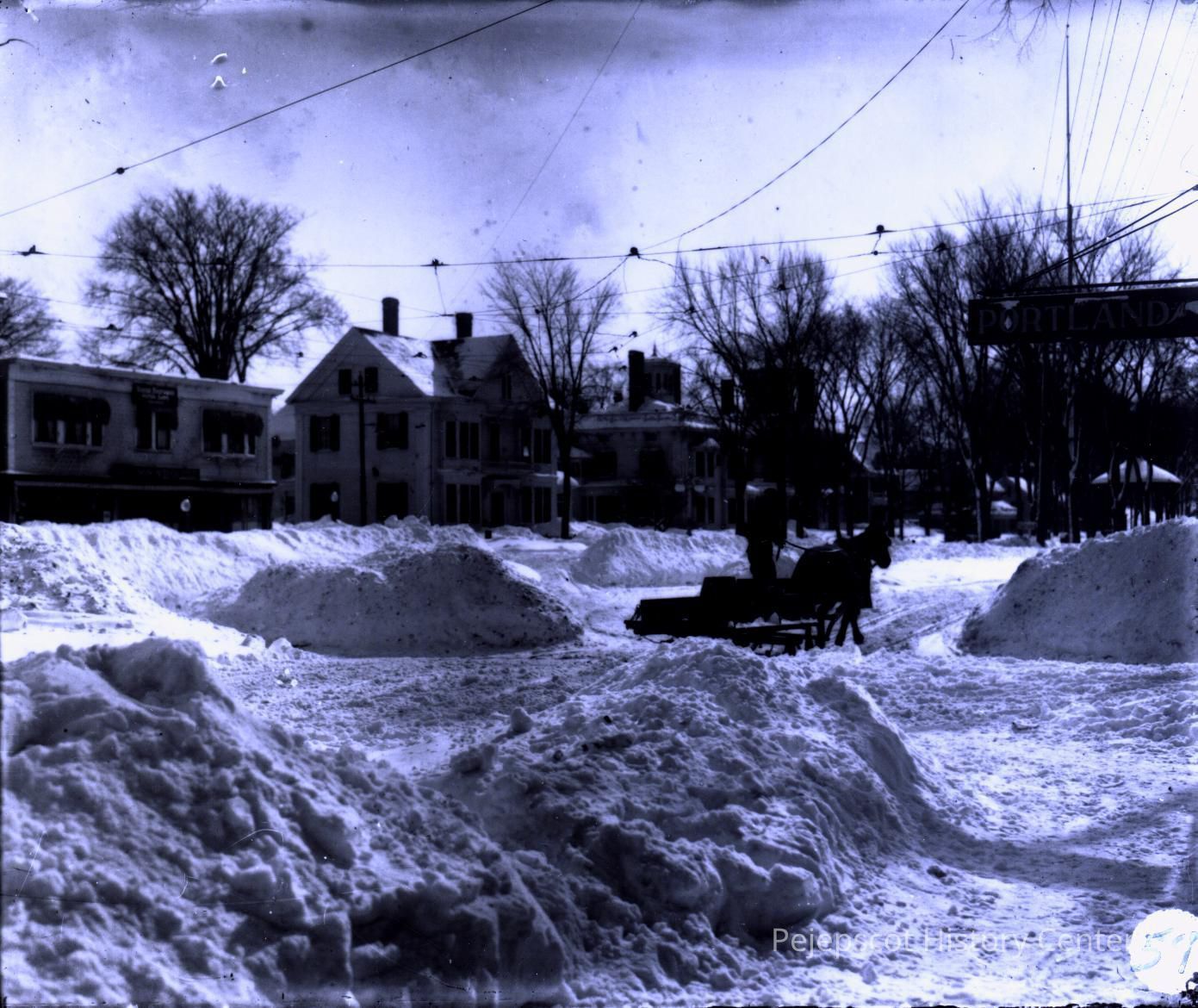 A B/W photograph of Maine Street, Brunswick, near the Pleasant Street intersection looking south towards PHS.