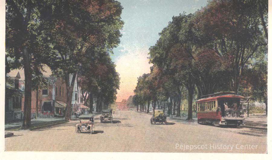 Postcard view of Maine Street, Brunswick, looking from near Bowdoin College toward Cabot Mill. Date unknown.