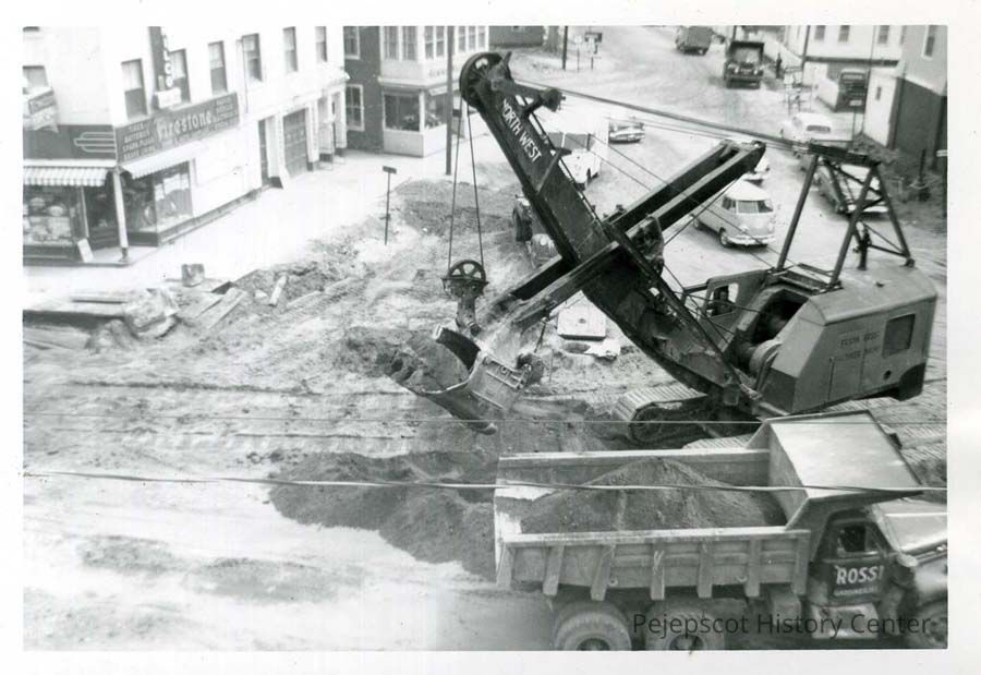 B/W photo of the Route 1 Bypass construction at the corner of Maine Street and Mason Street. Looking east from rooftop.