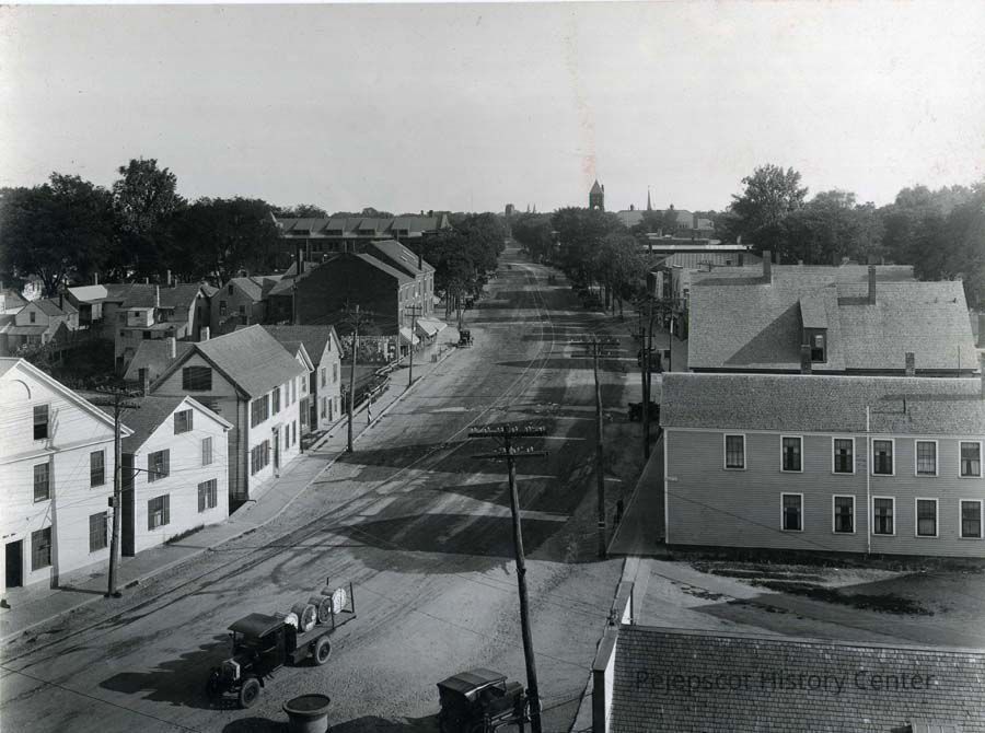 A B/W photograph of Maine Street from tower of Cabot Mill. August 1921