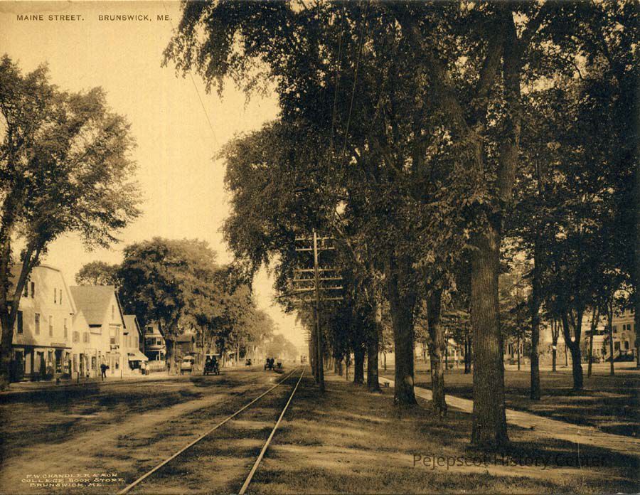 A Sepia postcard view of Maine Street looking north from the corner of Elm Street. The trolley tracks and the Mall can be seen. The postcard is by F.W. Chandler & Son, College Book Store. Undated