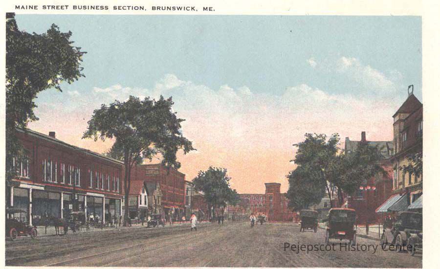 Postcard view of Maine Street Looking Toward Cabot Mills, Brunswick, Maine. Date unknown.