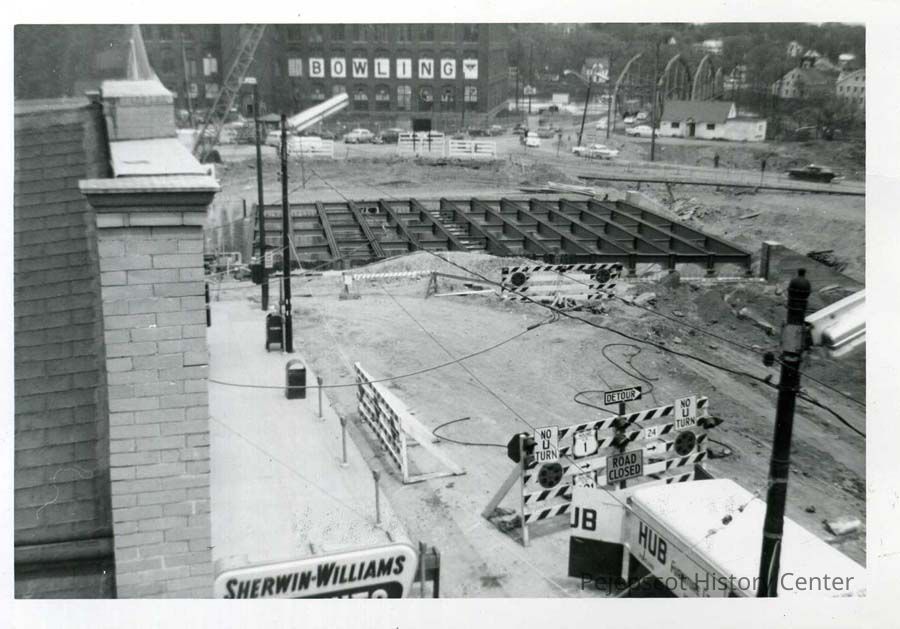 B/W photo of Maine Street during the construction of the overpass over the Route 1 bypass. Taken from the roof of the Pennell Block, 46-52 Maine Street.